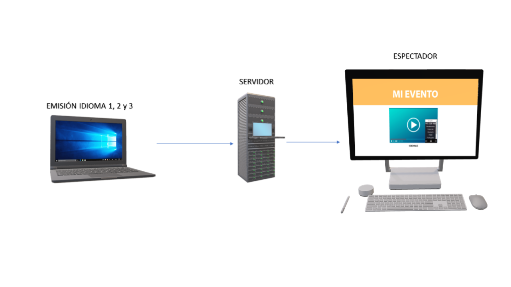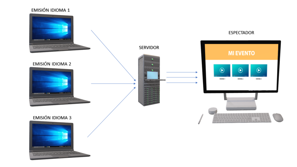 El sistema que usamos actualmente para emitir en varios idiomas nos permite generar un solo reproductor y el espectador selecciona en ese mismo reproductor en que idioma desea escuchar el evento, incluso puede ir cambiando de idioma cada vez que lo desee sin salir de la reproducci贸n del directo. Solo se genera una emisi贸n de v铆deo con los audios de cada idioma, es el servidor el que asigna cada audio al idioma correspondiente.